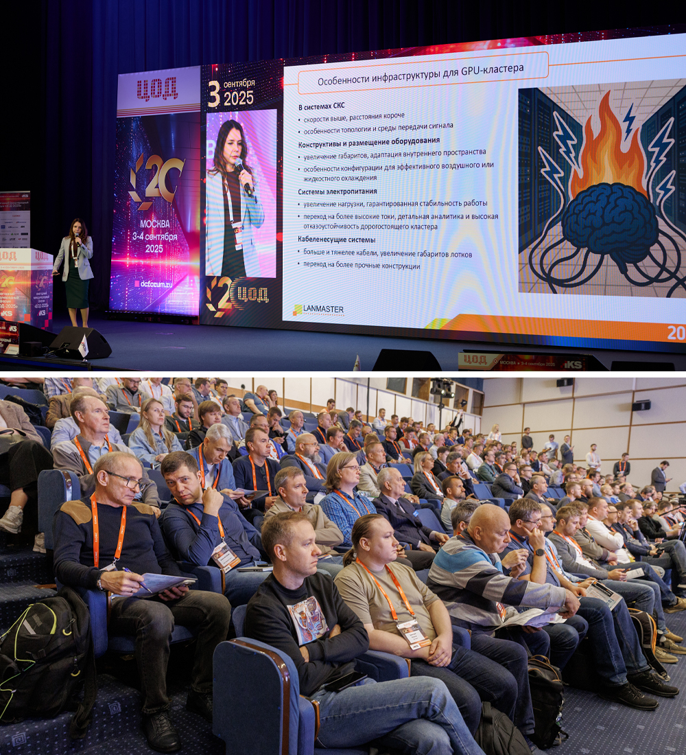 В рамках выступления были продемонстрированы решения LANMASTER для СКС в GPU-кластерах, элементы пассивной инфраструктуры ЦОД.