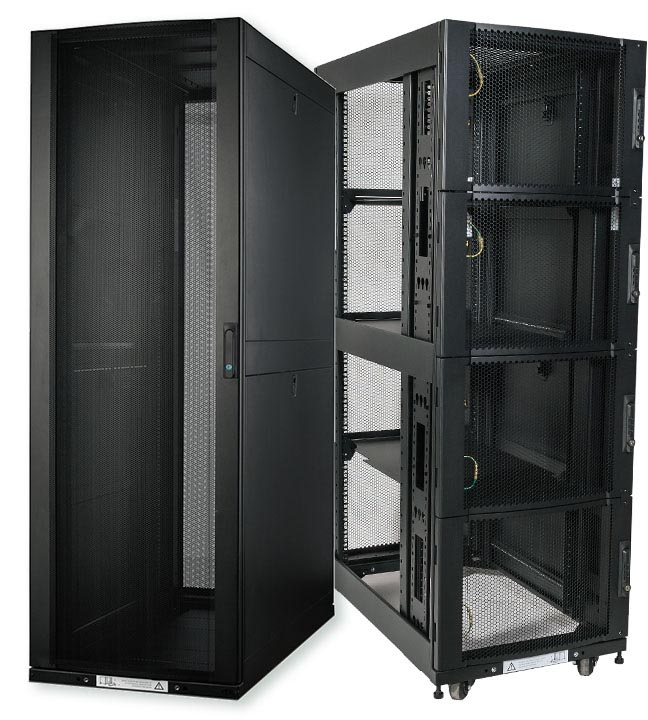 - Вертикальные лотки входят в комплект шкафа. Лотки имеют петли для быстрого монтажа вертикальных блоков распределения питания (PDU)