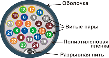 Витые пары собраны вместе, обернуты полиэтиленовой пленкой и заключены в общую оболочку из ПВХ (PVC).