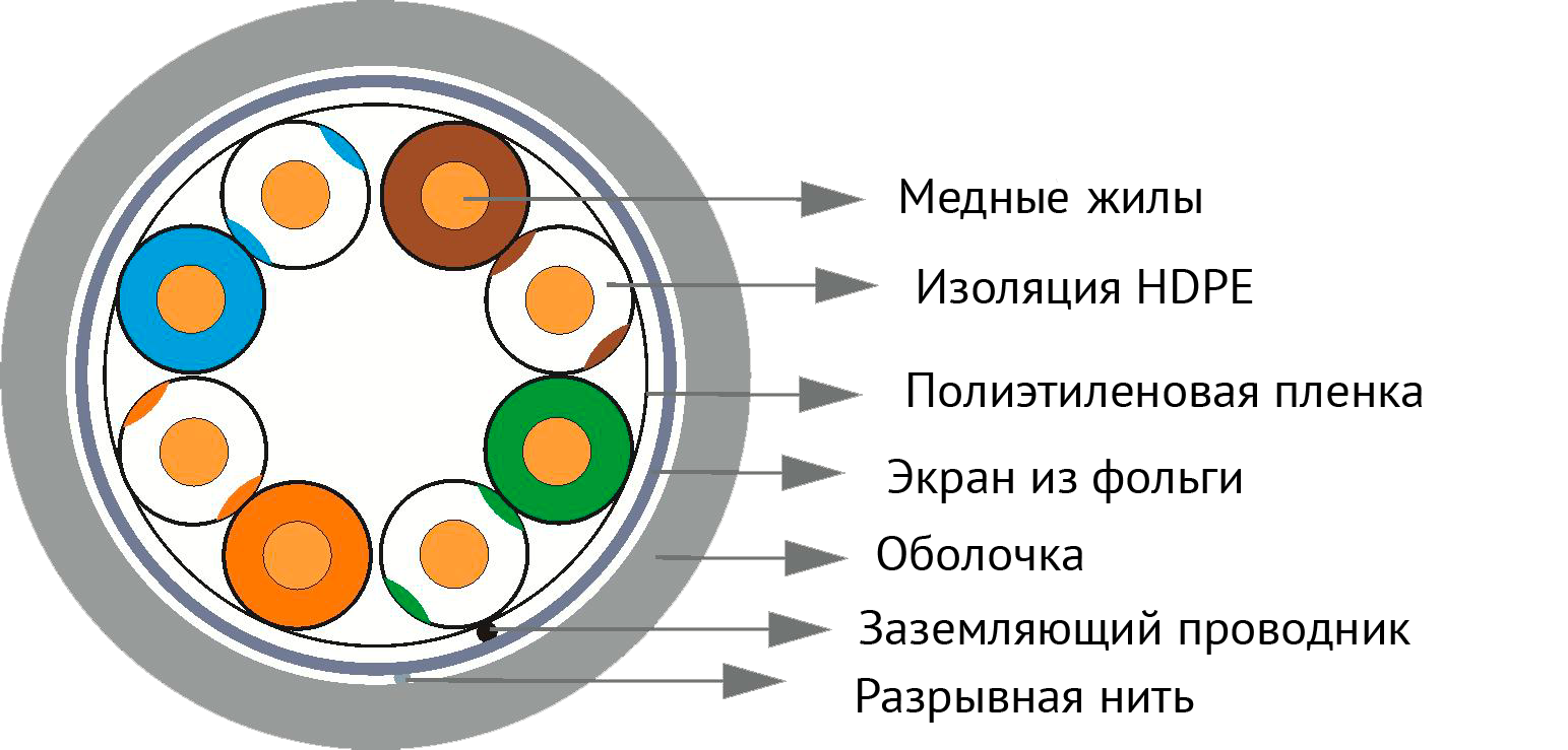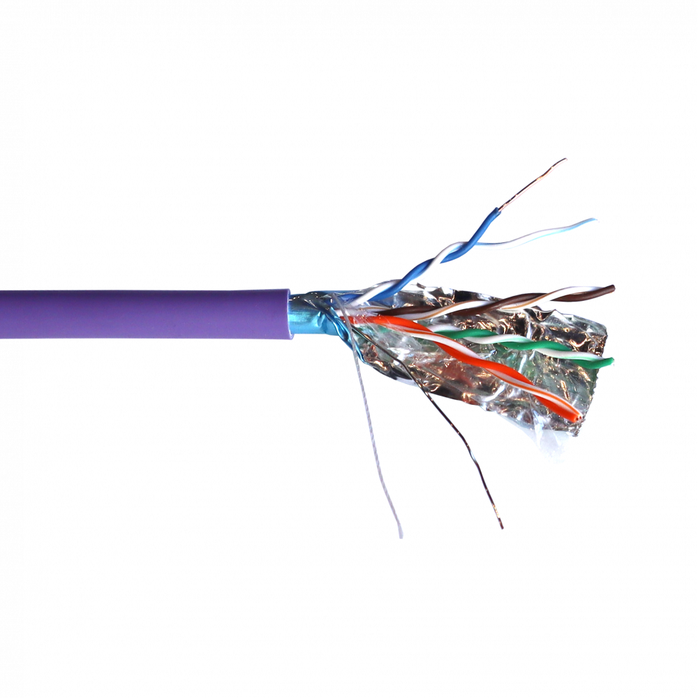 Экранированный кабель категории 5е для передачи цифровой и аналоговой информации на частотах до 100 МГц. Кабель состоит из 4-х витых пар одножильных медных проводников, окруженных общим экраном из фольги и заключенных в общую оболочку.