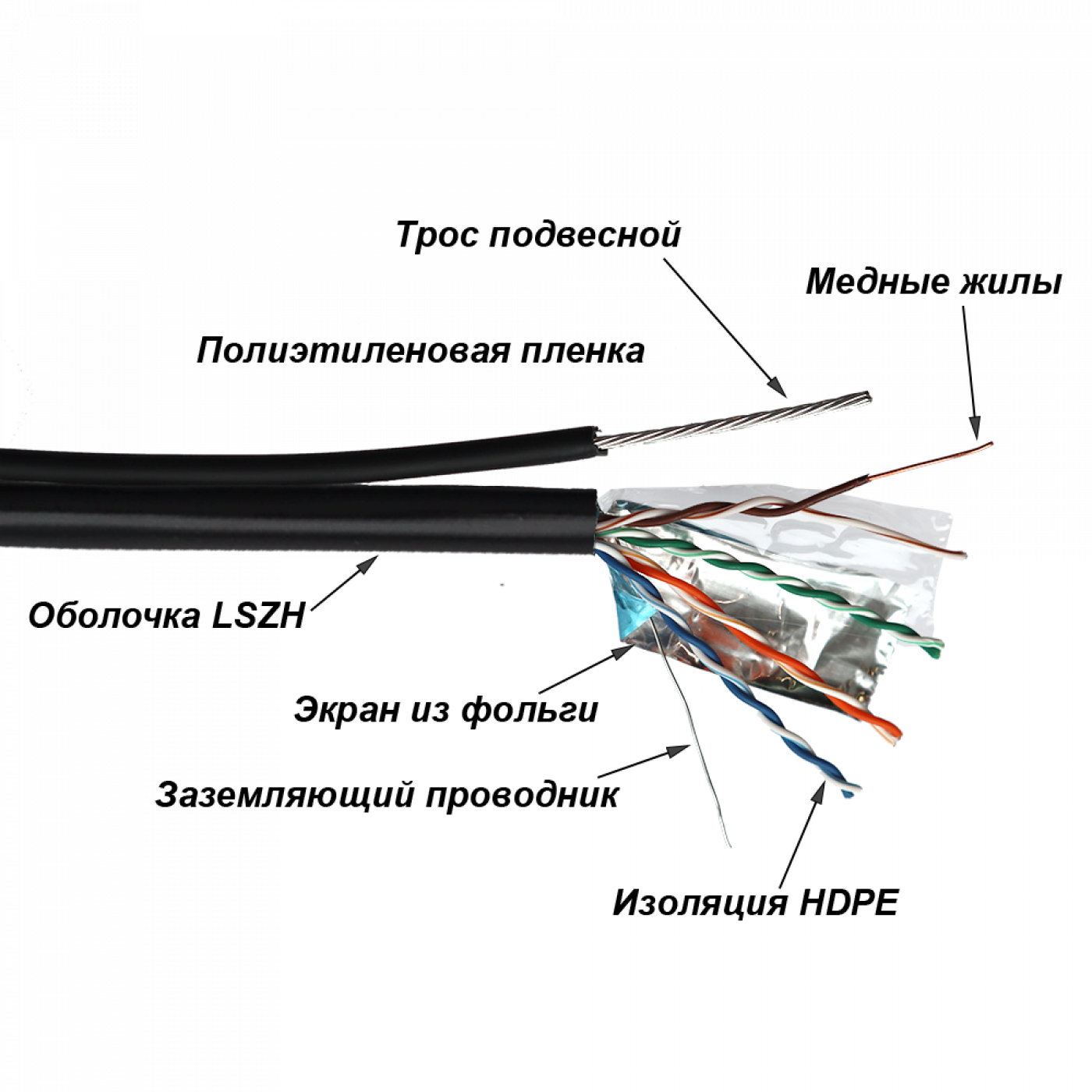 Проводник - сплошная медная жила диаметром 24AWG имеет изоляцию HDPE (полиэтилен высокой плотности).