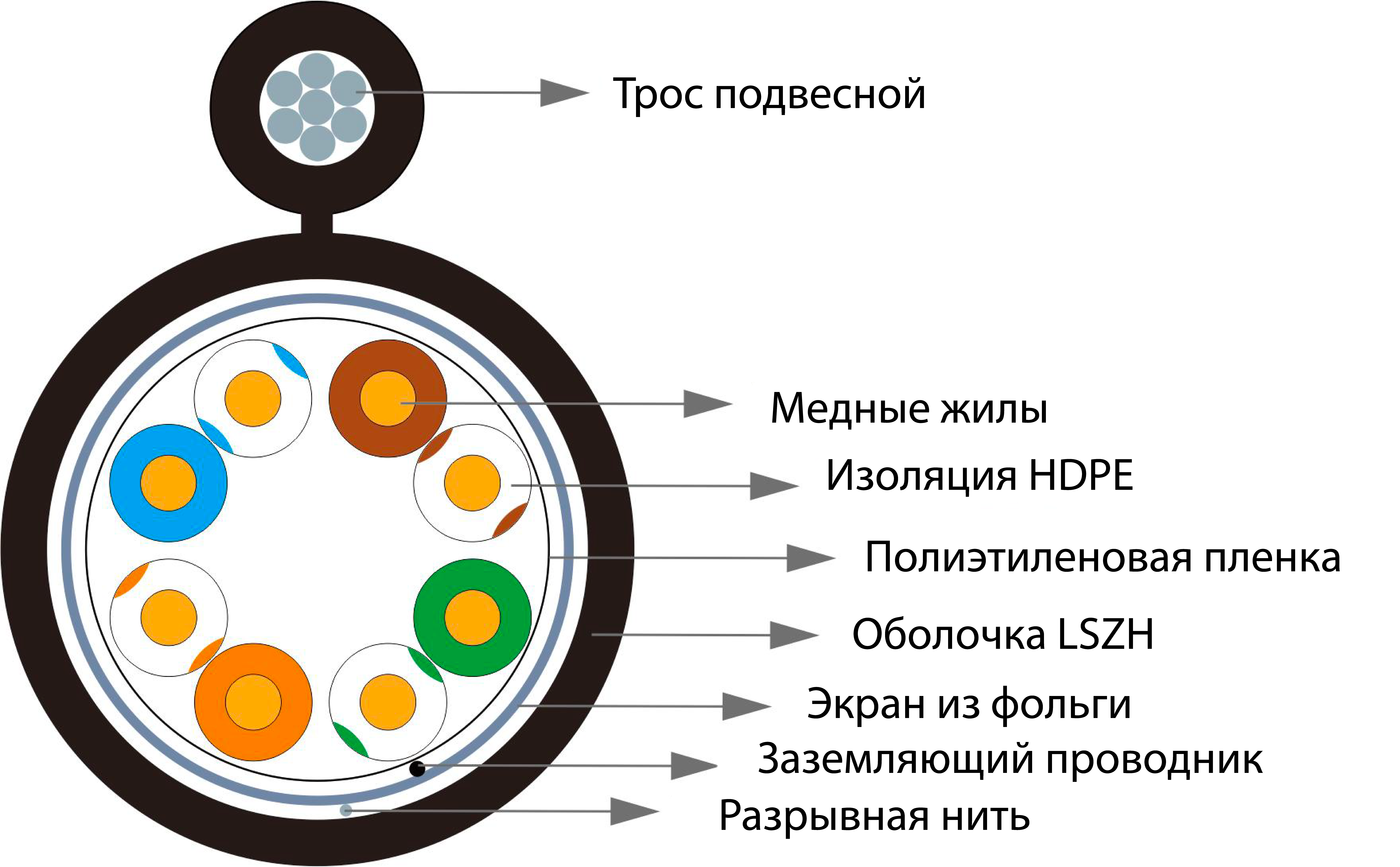 В конструкции подвесных кабелей используется многожильный стальной трос состоящий из 7 стальных проволок диаметром 0.5 мм, оболочка троса соединена с оболочкой кабеля, образуя "восьмерку".