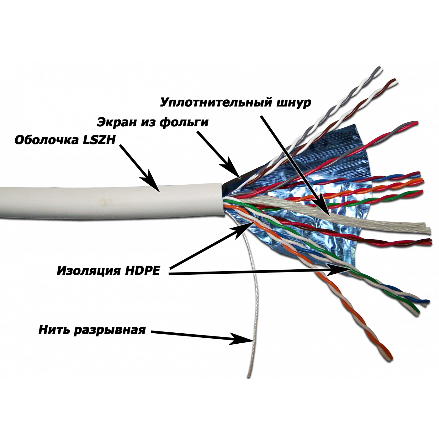 Витые пары собраны вокруг центрального элемента и заключены в общую оболочку из LSZH(низкодымящая, не содержит галогенов).