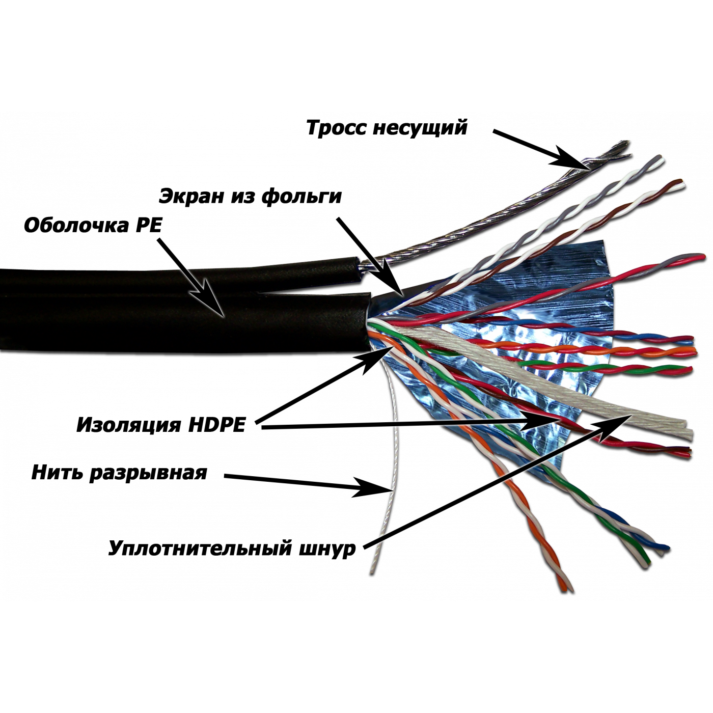 Каждый проводник заключен в изоляцию HDPE (полиэтилен высокой плотности). Два проводника, скрученных со специально подобранным шагом, составляют одну витую пару.