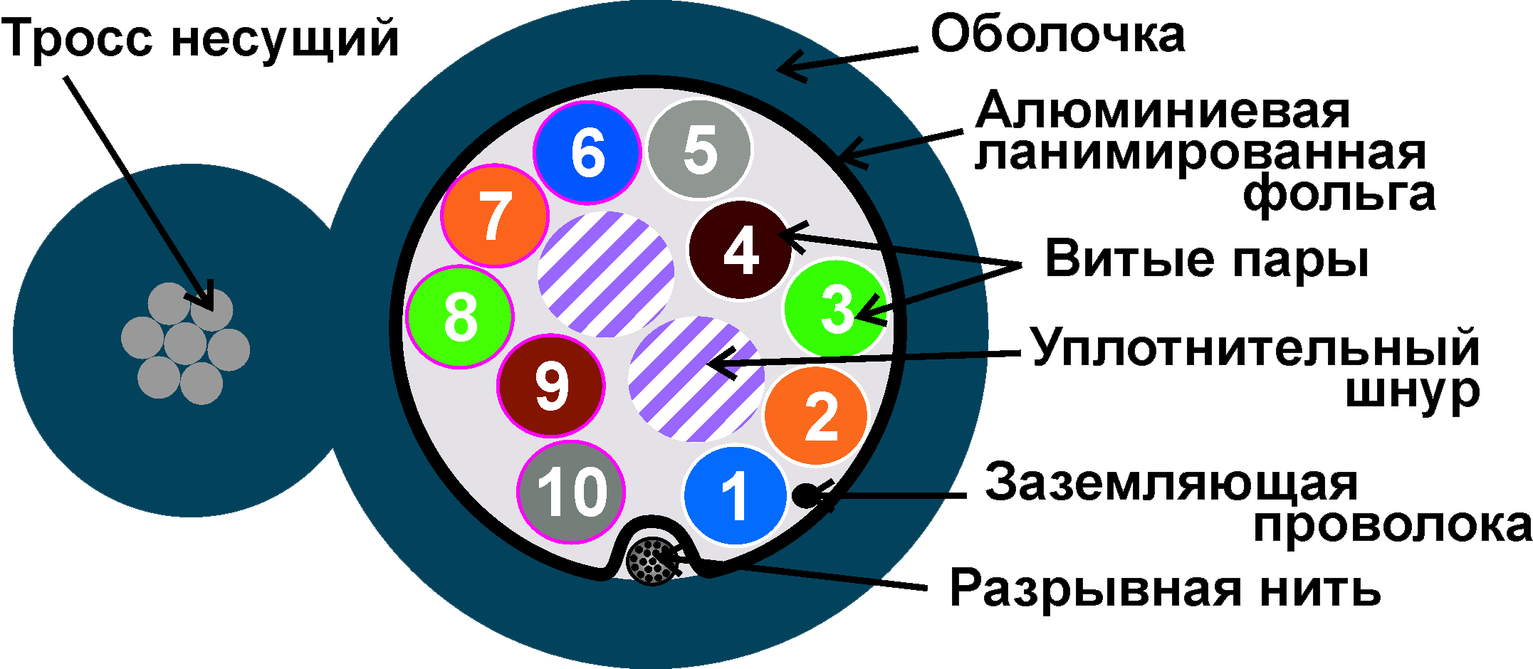 В конструкции кабеля используется многожильный стальной трос состоящий из 7 стальных проволок диаметром 0.5 мм, оболочка троса соединена с оболочкой кабеля, образуя "восьмерку". Кабель с тросом предназначен для подвеса на воздушных линиях связи.