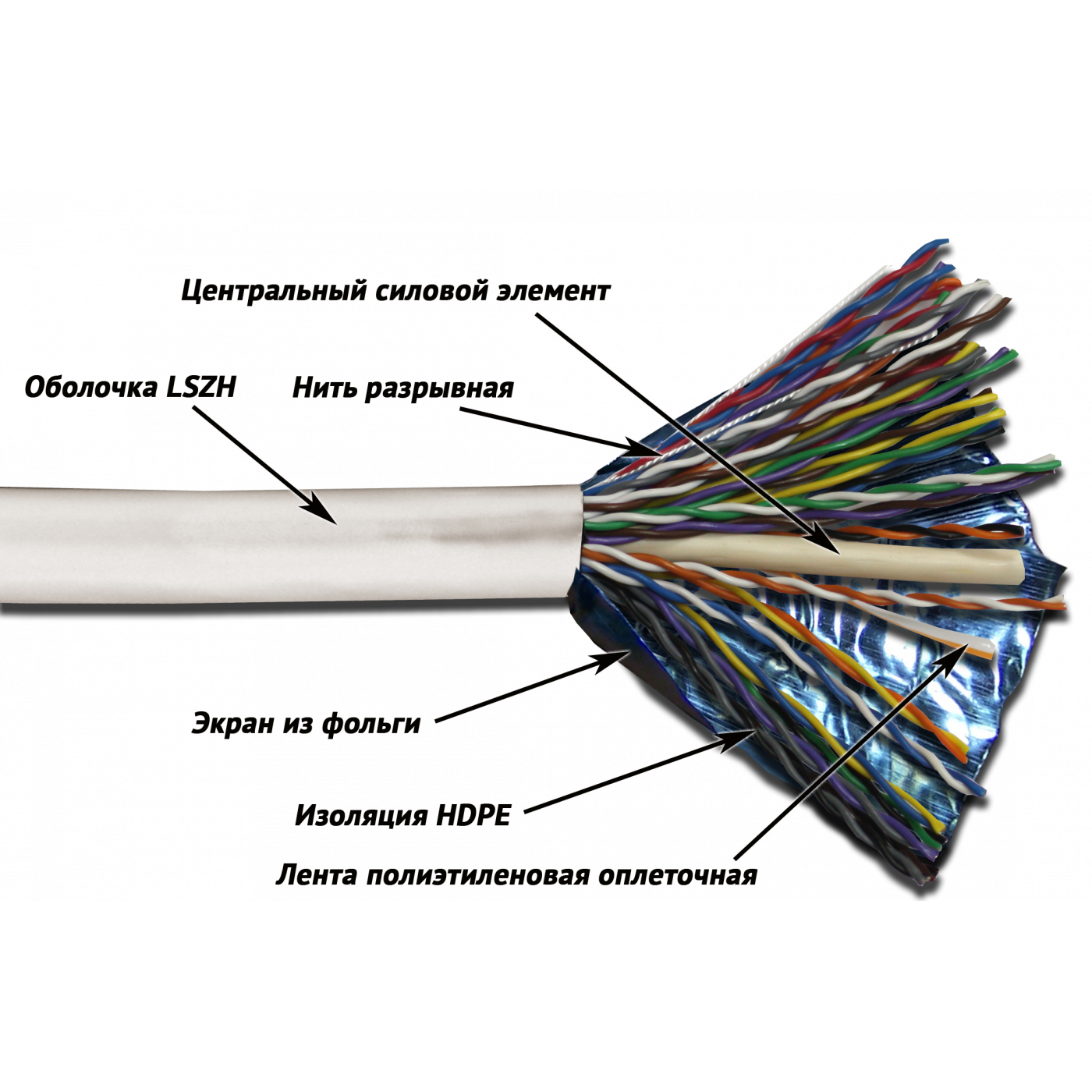 Витые пары собраны вокруг центрального элемента и заключены в общую оболочку из LSZH(низкодымящая, не содержит галогенов).