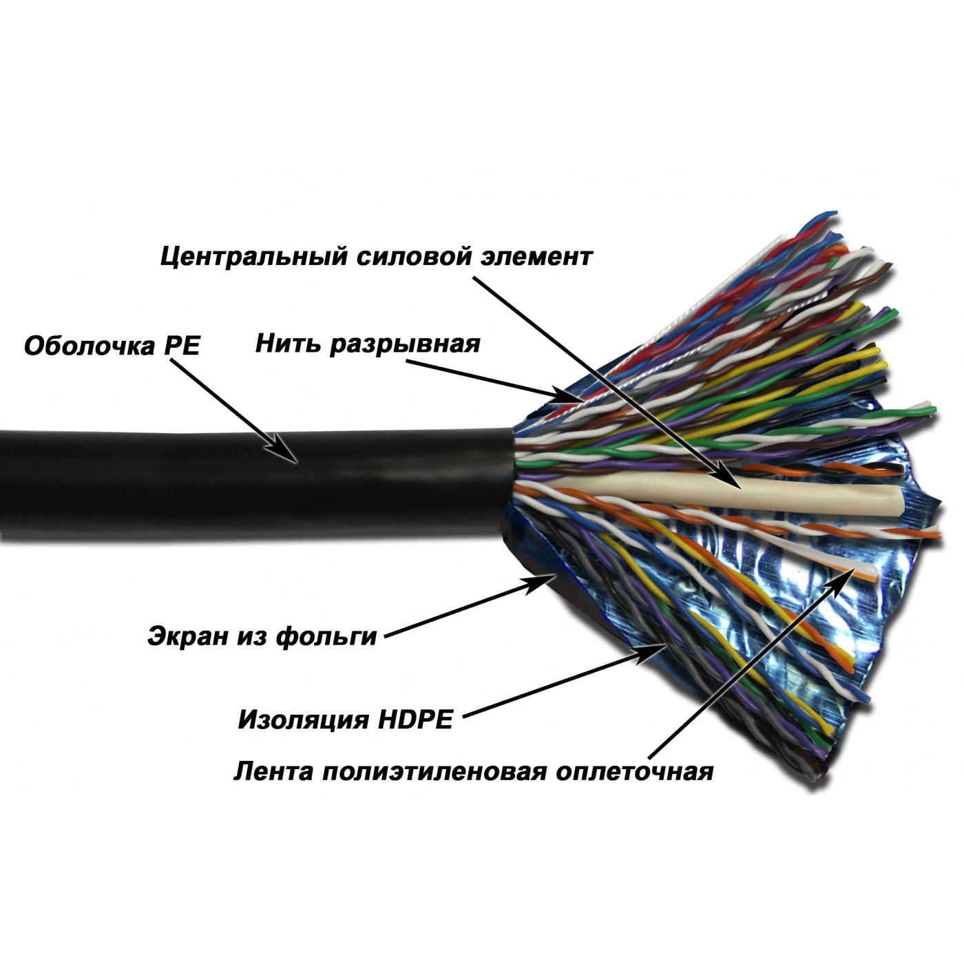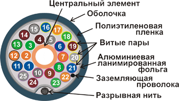 Витые пары собраны вокруг центрального элемента, обернуты полиэтиленовой пленкой и общим экраном и заключены в общую оболочку из полиэтилена (PЕ).