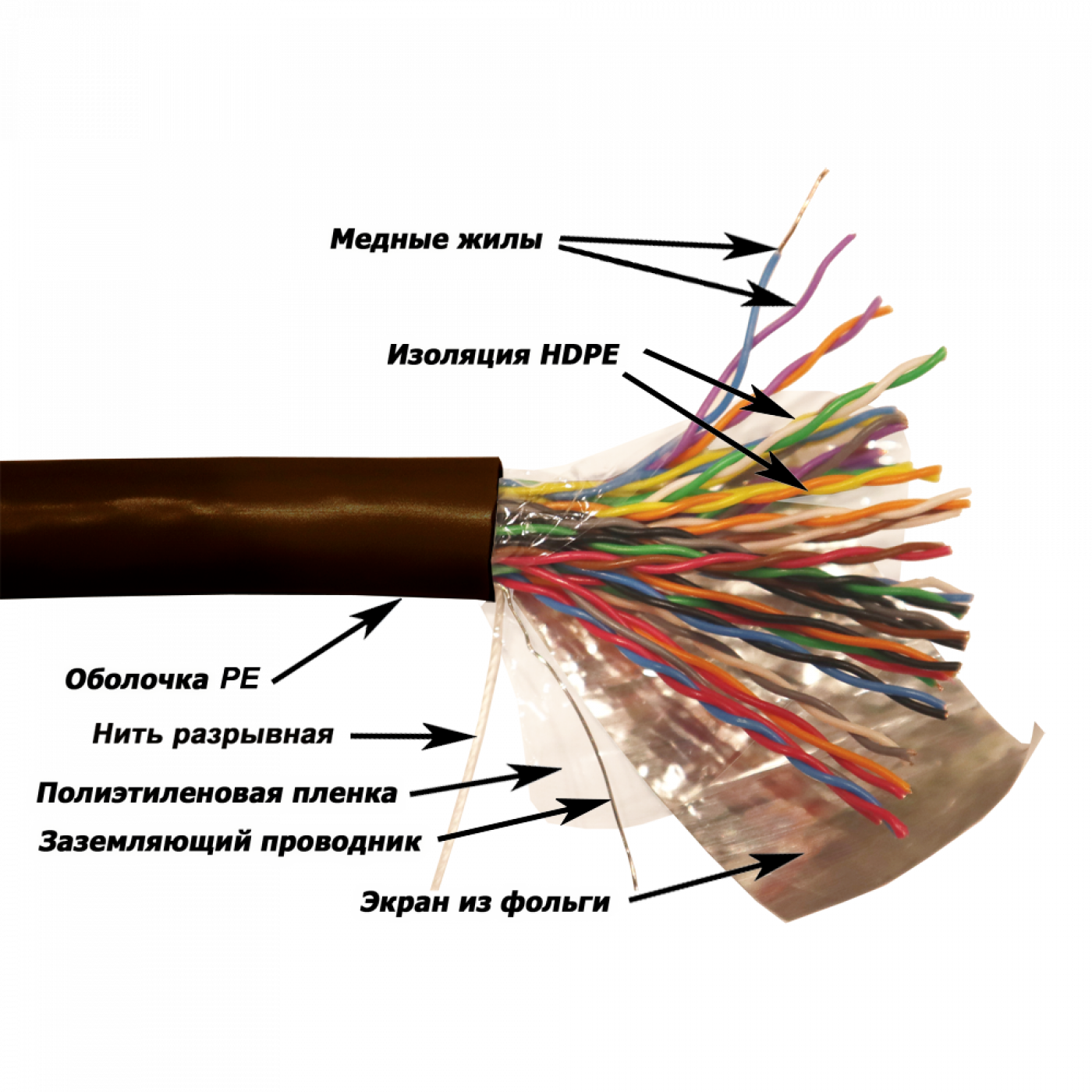 Каждый проводник заключен в изоляцию HDPE (полиэтилен высокой плотности). Два проводника, скрученных со специально подобранным шагом, составляют одну витую пару.