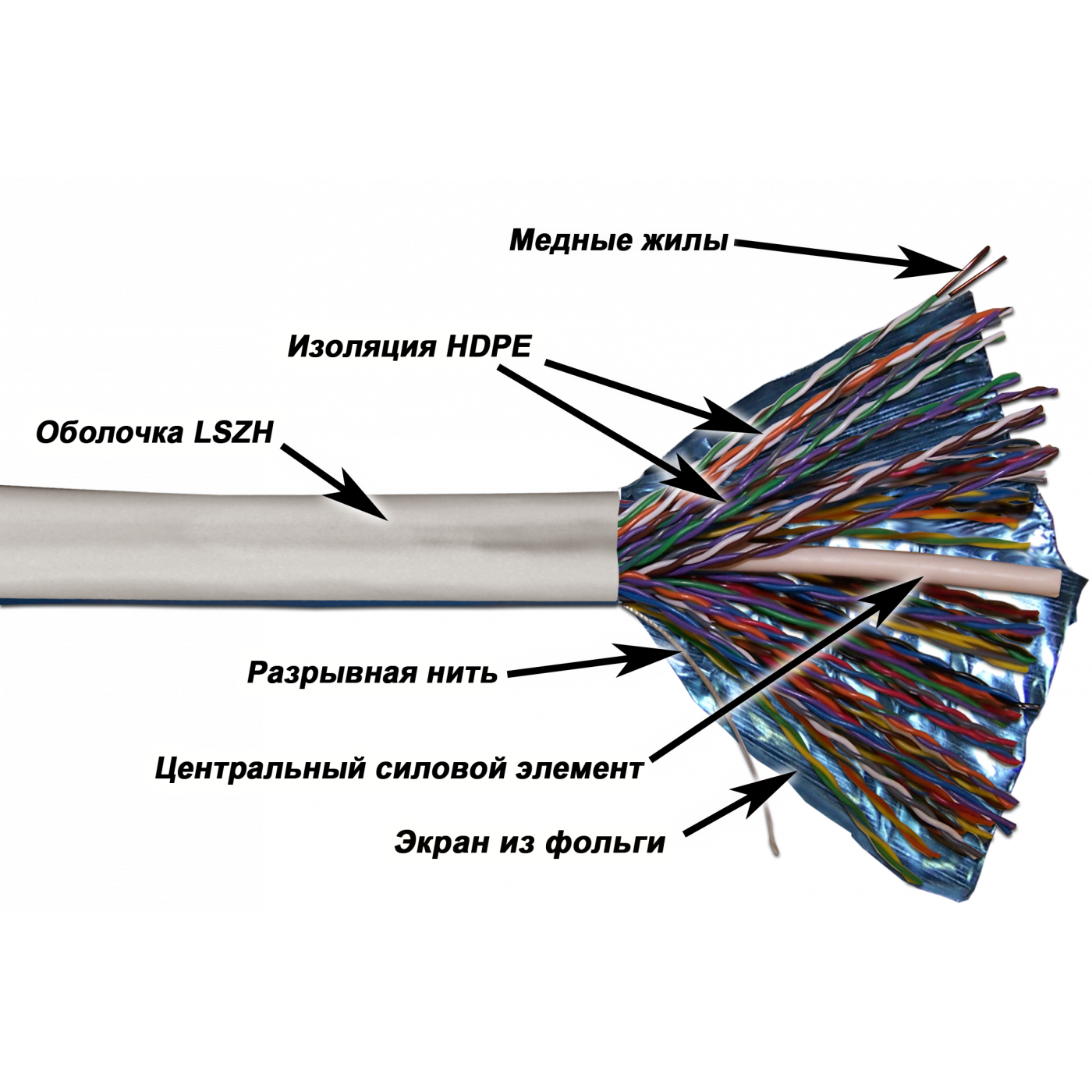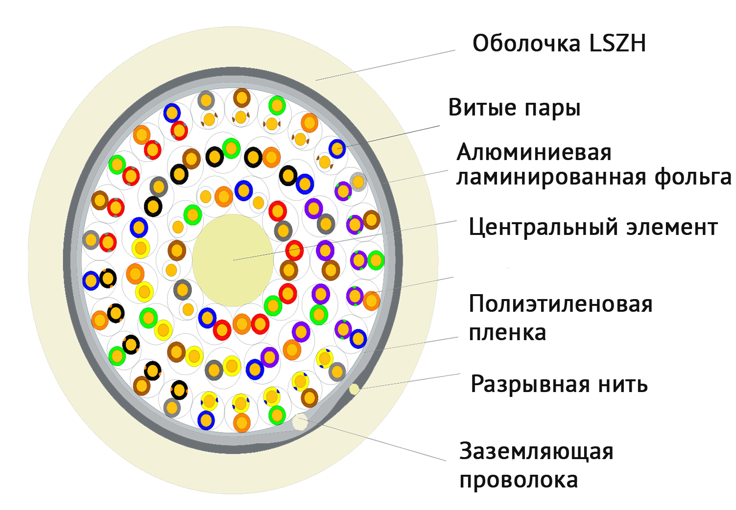 Витые пары собраны вокруг центрального элемента и заключены в общую оболочку из LSZH(низкодымящая, не содержит галогенов).