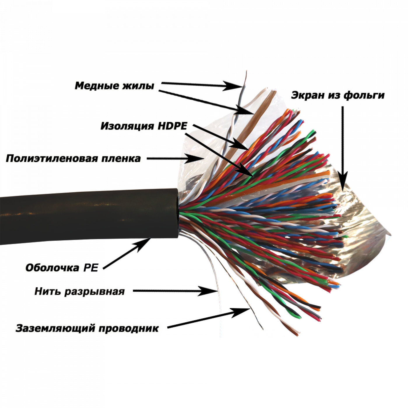 Витые пары собраны вокруг центрального элемента и заключены в общую оболочку из LDPE.
