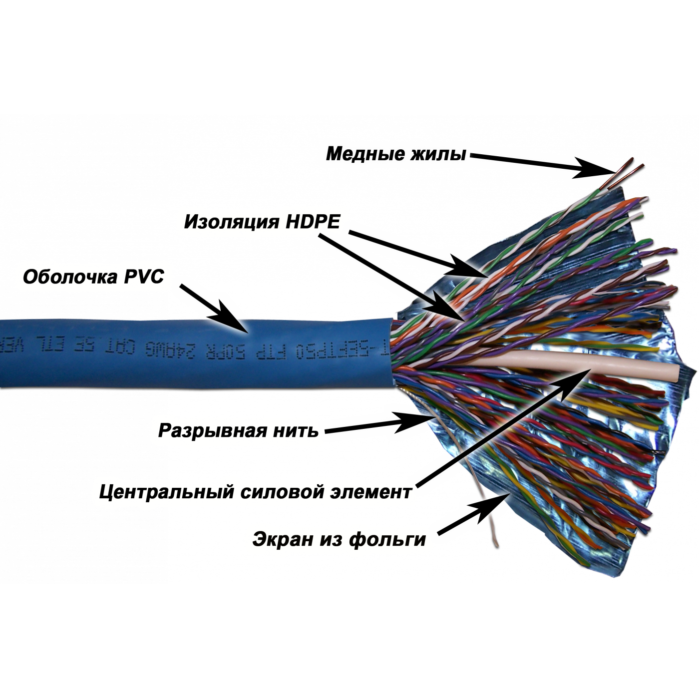 Многопарный экранированный кабель предназначен для передачи данных, телефонных и телевизионных сигналов на частотах до 100 МГц. Кабель состоит 50 пар одножильных медных проводников. Внешняя оболочка: PVC. Диаметр проводника – 24 AWG.
