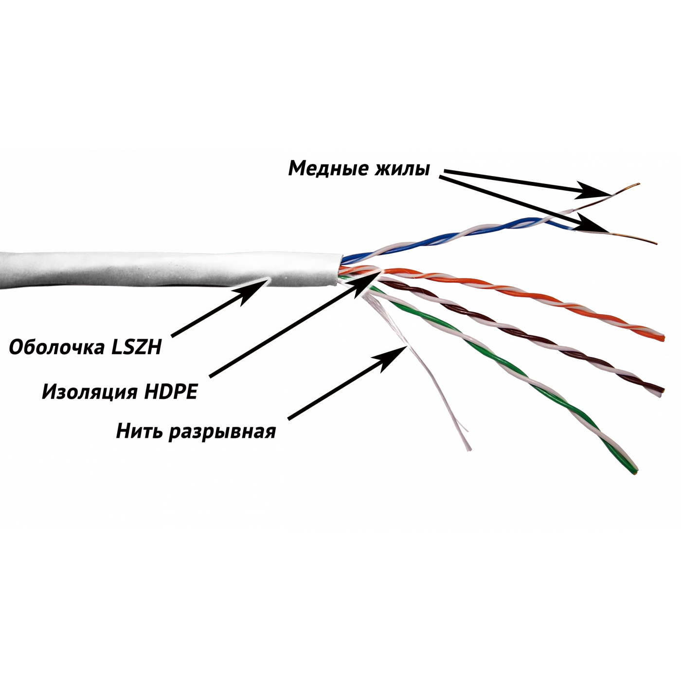 Неэкранированный кабель категории 5е для передачи цифровой и аналоговой информации на частотах до 100 МГц. Кабель состоит из 4-х витых пар одножильных медных проводников, заключенных в общую оболочку.