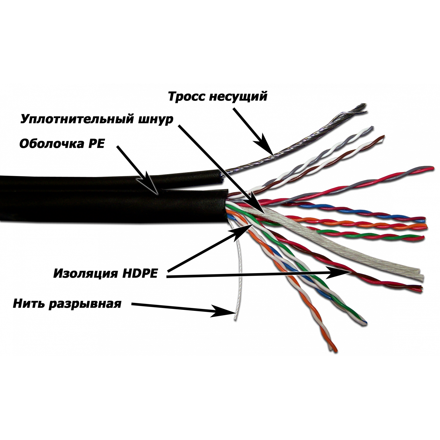 Каждый проводник заключен в изоляцию HDPE (полиэтилен высокой плотности). Два проводника, скрученных со специально подобранным шагом, составляют одну витую пару.