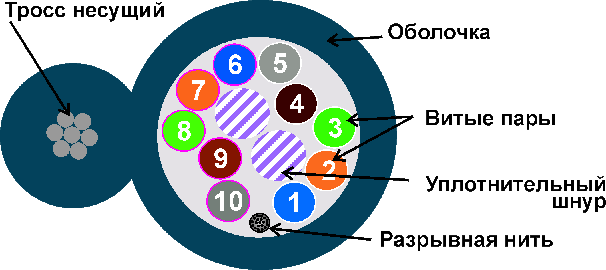 В конструкции кабеля используется многожильный стальной трос состоящий из 7 стальных проволок диаметром 0.5 мм, оболочка троса соединена с оболочкой кабеля, образуя "восьмерку". Кабель с тросом предназначен для подвеса на воздушных линиях связи.