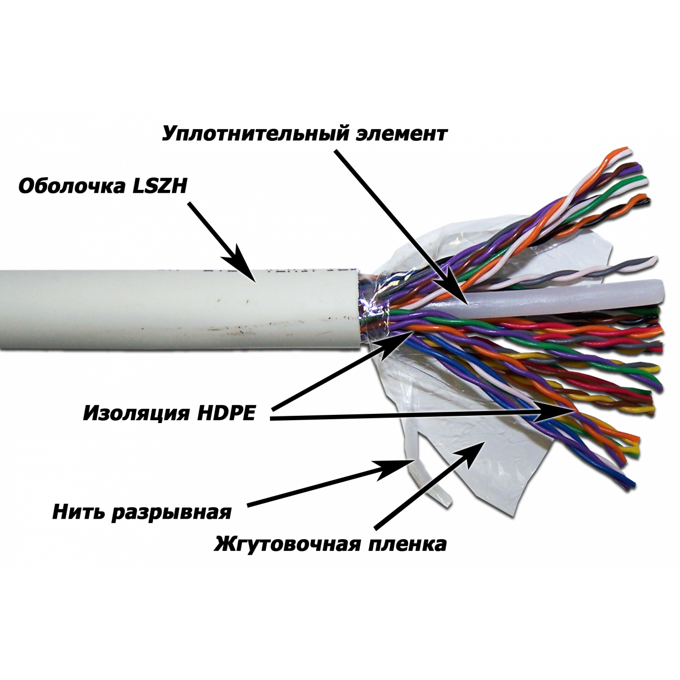 Многопарный неэкранированный кабель предназначен для передачи данных, телефонных и телевизионных сигналов на частотах до 100 МГц. Кабель состоит 25 пар одножильных медных проводников. Внешняя оболочка: LSZH. Диаметр проводника – 24 AWG.