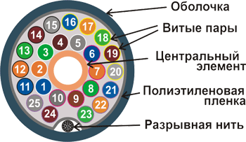 Кабель состоит из 25-ти пар одножильных медных проводников.