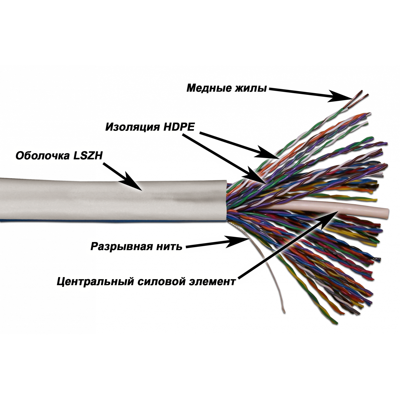 Витые пары собраны вокруг центрального элемента и заключены в общую оболочку из LSZH(низкодымящая, не содержит галогенов).