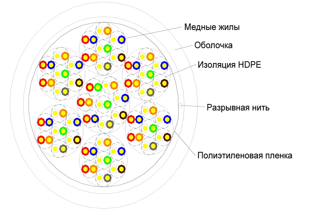 Каждый проводник заключен в изоляцию HDPE (полиэтилен высокой плотности). Два проводника, скрученных со специально подобранным шагом, составляют одну витую пару.