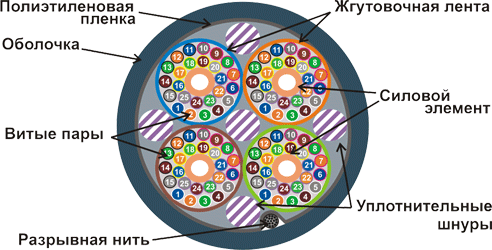 Группы по 25 витых пар, собранных вокруг центрального элемента, обернуты жгутовочной лентой своего цвета. Четыре группы витых пар переложены уплотнительными шнурами из полипропилена и заключены в общую оболочку из ПВХ (PVC).