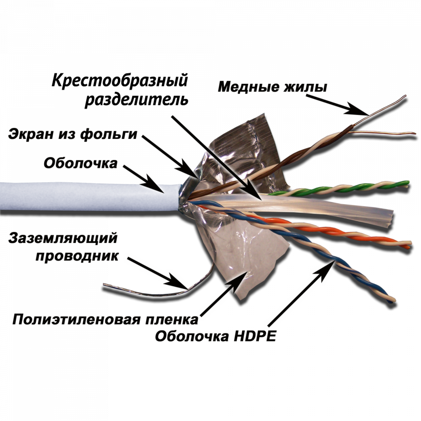 Кабель состоит из 4-х витых пар одножильных медных проводников, разделенных крестообразной перегородкой и заключенных в общий экран из фольги и внешнюю оболочку.