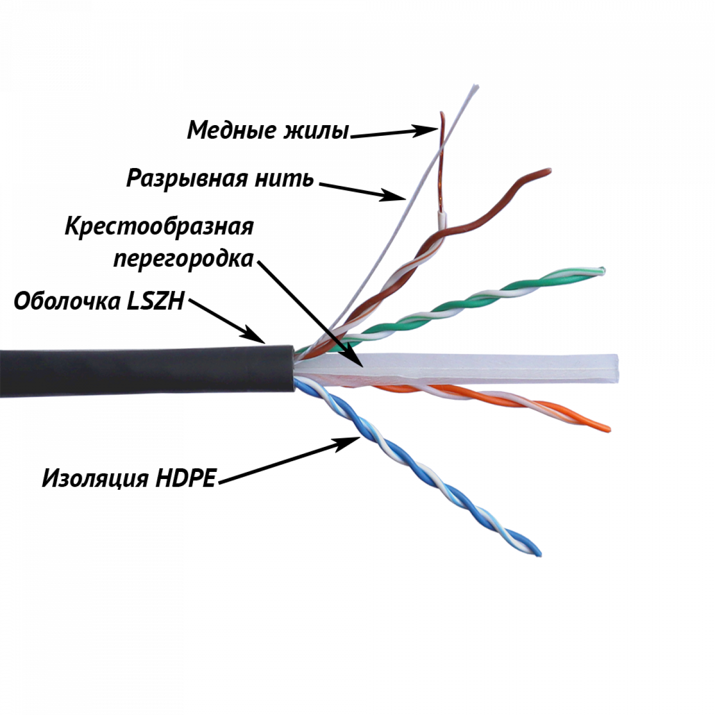 Проводник - сплошная медная жила диаметром 23AWG имеет изоляцию HDPE (полиэтилен высокой плотности).