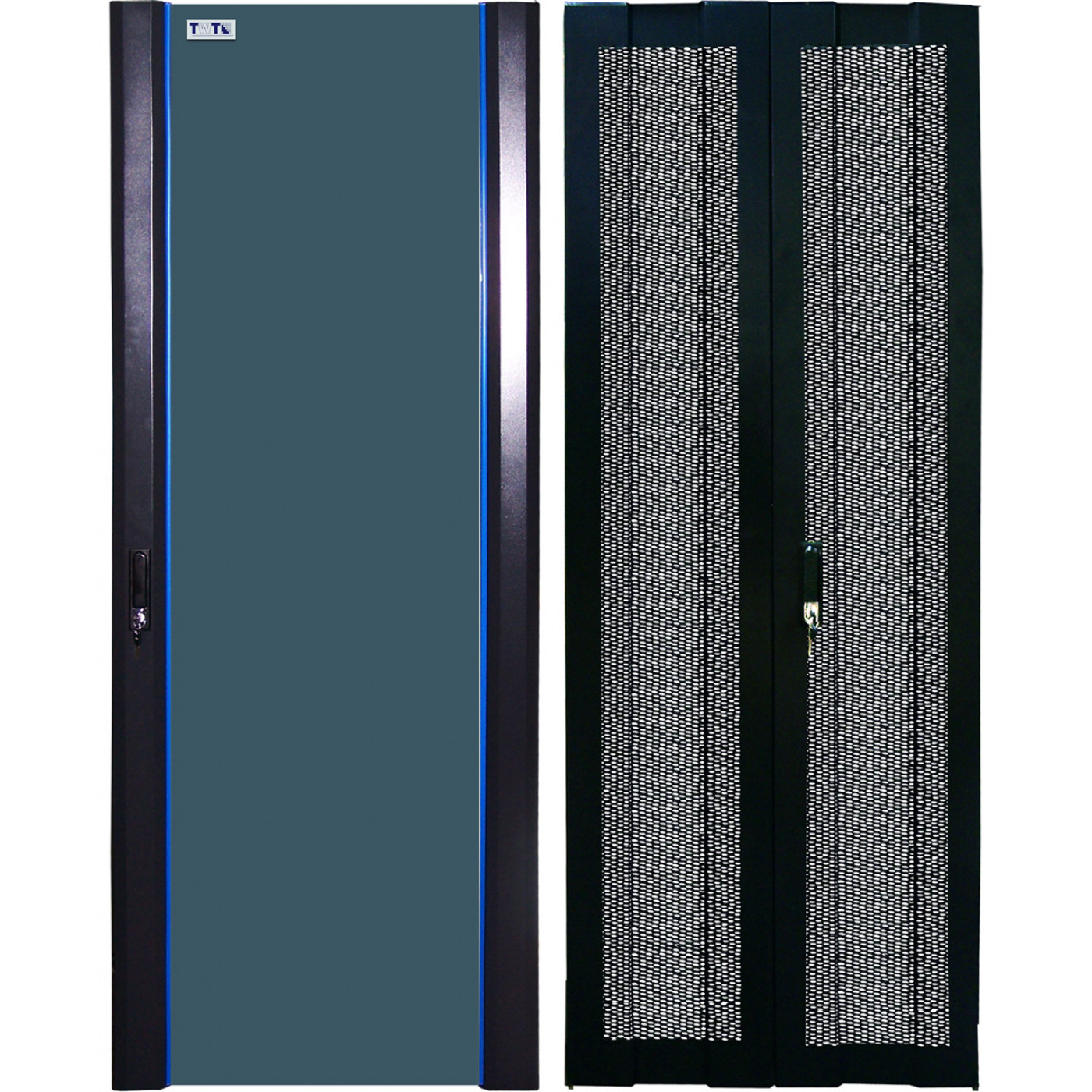 Комбинированный комплект дверей для шкафов TWT серии Business, состоящий из одностворчатой стеклянной двери и двухстворчатой распашной перфорированной двери с перфорацией. Любая дверь может использоваться в качестве передней или задней, крепление двери на шкаф позволяет монтировать двери для открывания как на правую, так и на левую сторону.