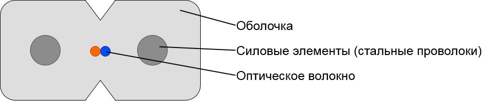 Кабель содержит несколько оптических волокон. Волокна и силовые элементы находятся в оболочке. Два силовых элемента из стальных проволок обеспечивают защиту от механических воздействий. Оболочка кабеля изготавливается из полимерного материала, не распространяющего горение, с пониженным дымо- и газовыделением.