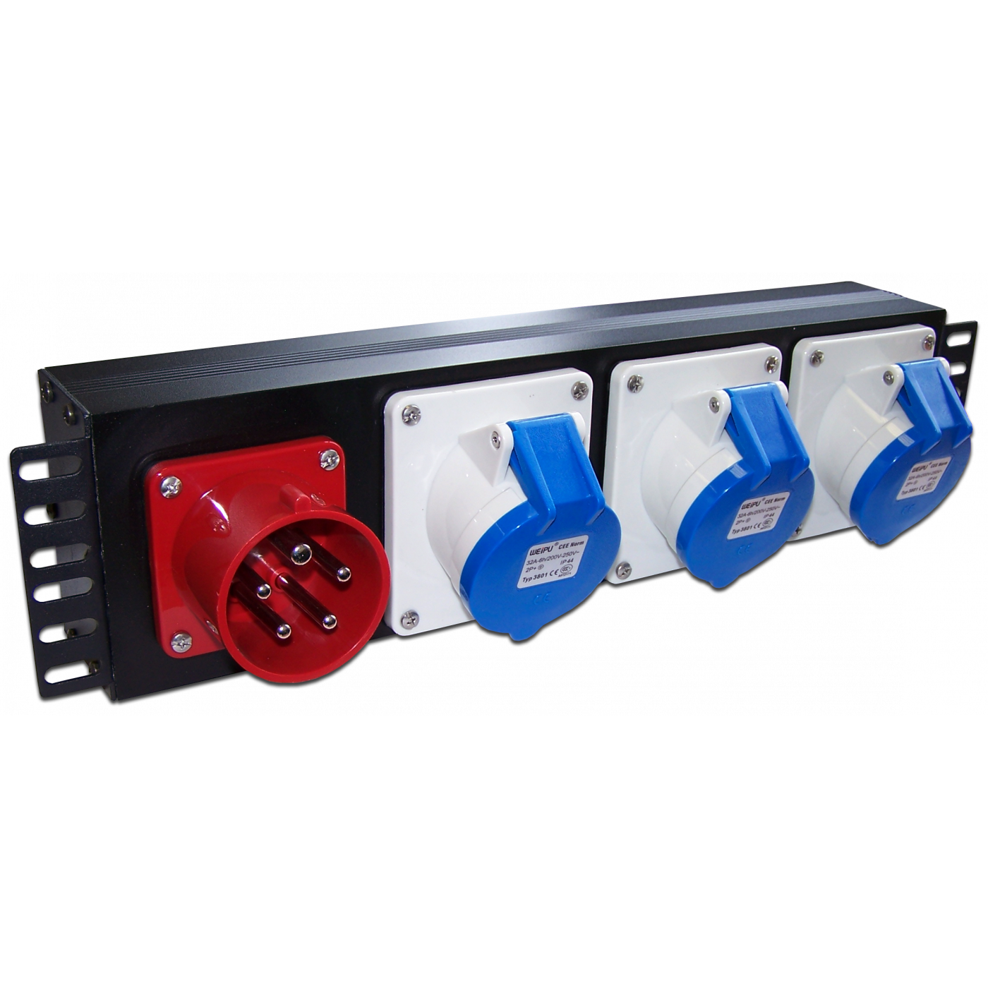 Трехфазный блок розеток IEC 309 предназначен для установки в 19" шкафы и стойки. Блок используется для разделения трехфазного питания входной розетки на три отдельные фазы входных розеток. Подключаемые устройства должны иметь кабель питания, оборудованный однофазным разъемом 250V IEC 309 (синий корпус, контакт заземления расположен на 6 часов). Блок имеет одну входную и три выходных розетки.