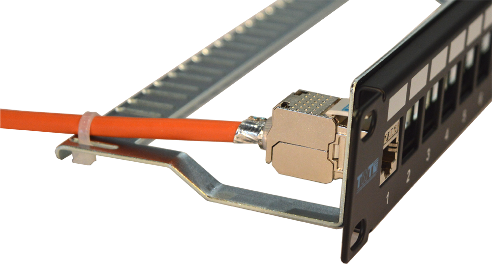 Для удобства монтажа и дополнительной фиксации кабеля в конструкции панели имеется поддерживающая скоба. Использование скобы обеспечивает требуемый радиус изгиба и надежную фиксацию кабелей в процессе терминации и последующей эксплуатации. Фиксация кабеля осуществляется пластиковыми стяжками при помощи специальных отверстий в скобе.