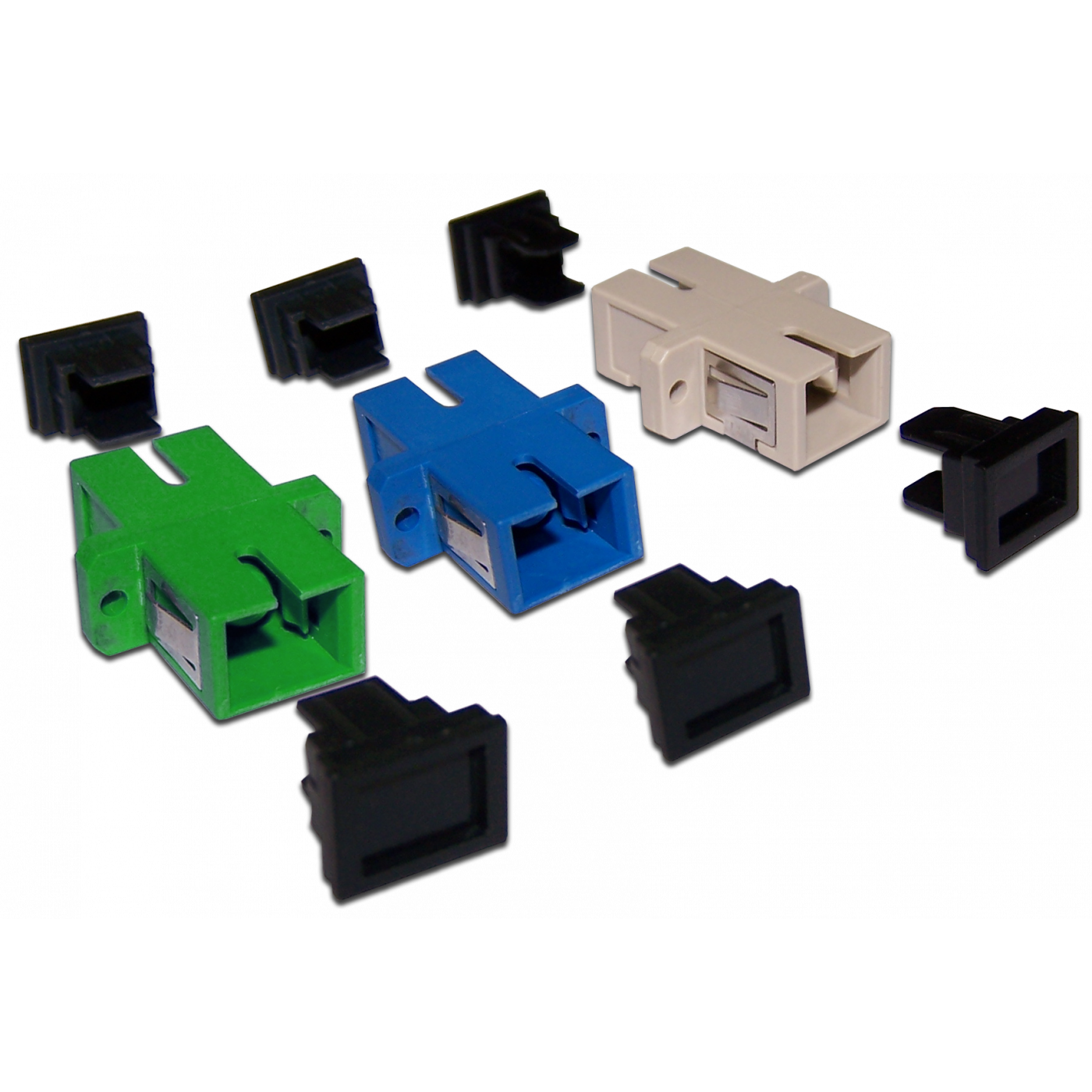 Производятся адаптеры для многомодовых (бежевый корпус) и одномодовых (синий корпус) коннекторов. Кроме того производятся адаптеры для одномодовых коннекторов с угловой шлифовкой APC (зеленый корпус).