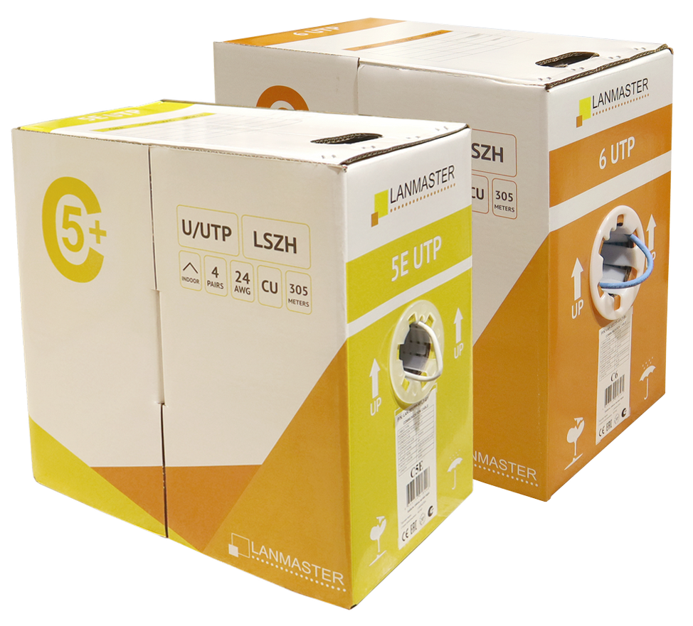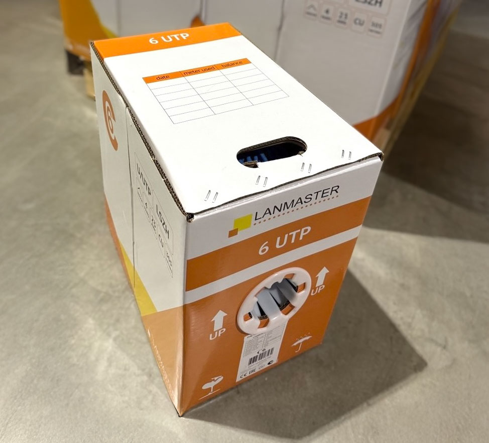 Для удобной визуальной идентификации, коробки имеют цветовую кодировку: жёлтый цвет соответствует категории 5е, оранжевый используется для обозначения кабеля 6-й категории. Это позволит сэкономить время монтажников и складского персонала.